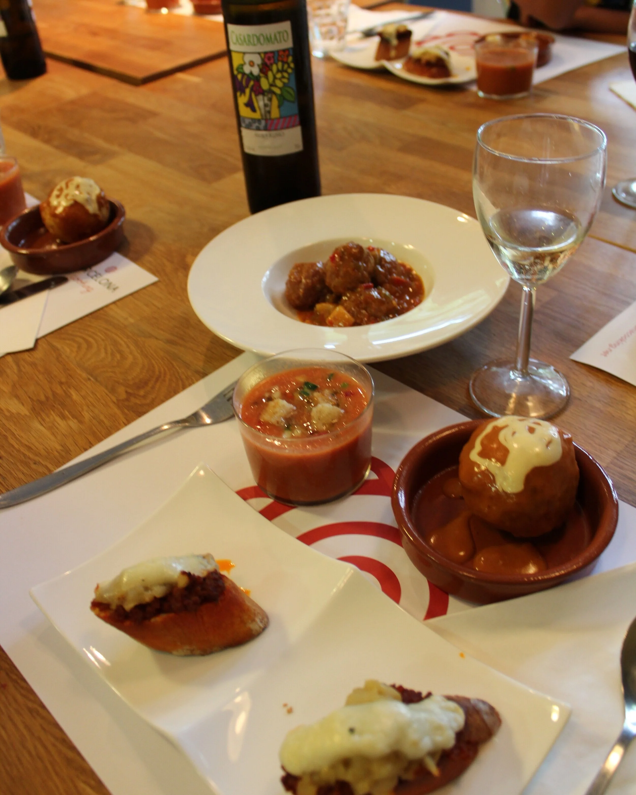 With supplies in hand, our group climbed a narrow stairway to the blue and white tiled kitchen. A butcher-block dining and work table was set with all the ingredients to prepare the Catalan tapas menu of Pintxo de Sobrasada (sautéed sausage with caramelized pears and blue cheese on toast), Mar y Montana (meatballs with cuttlefish), Barelonetta Potato Bombs (deep fried mashed potatoes stuffed with beef and vegetables), and Gazpacho Andaluz (the classic with sherry vinegar for zest and bread crumbs for texture).